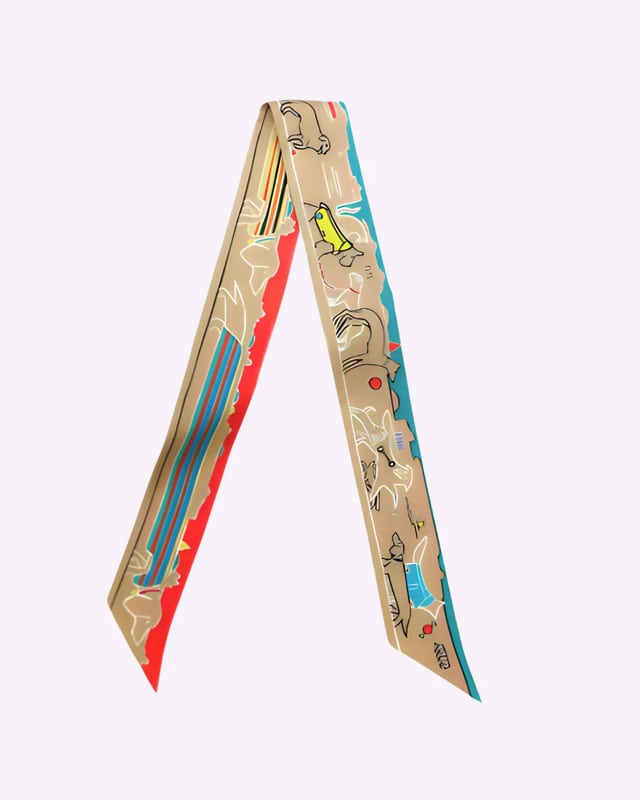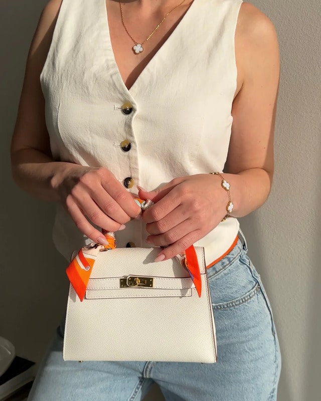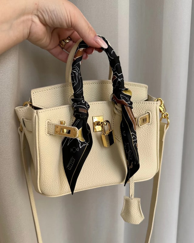 Elevate your handbag’s style with a stunning twilly scarf, perfectly wrapped around the handle. Its versatility knows no bounds—use it as a chic neck scarf or a trendy hair accessory for an effortlessly polished look.